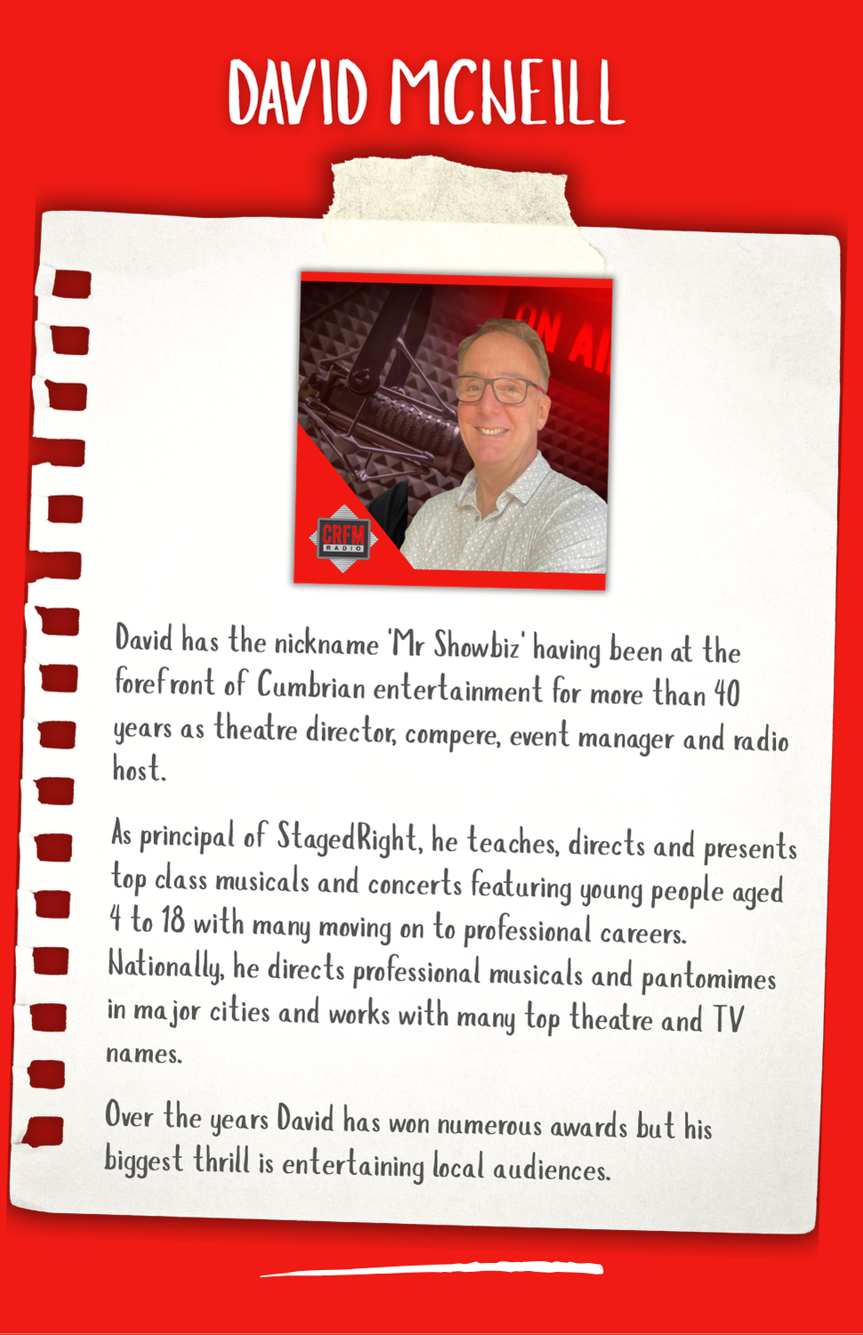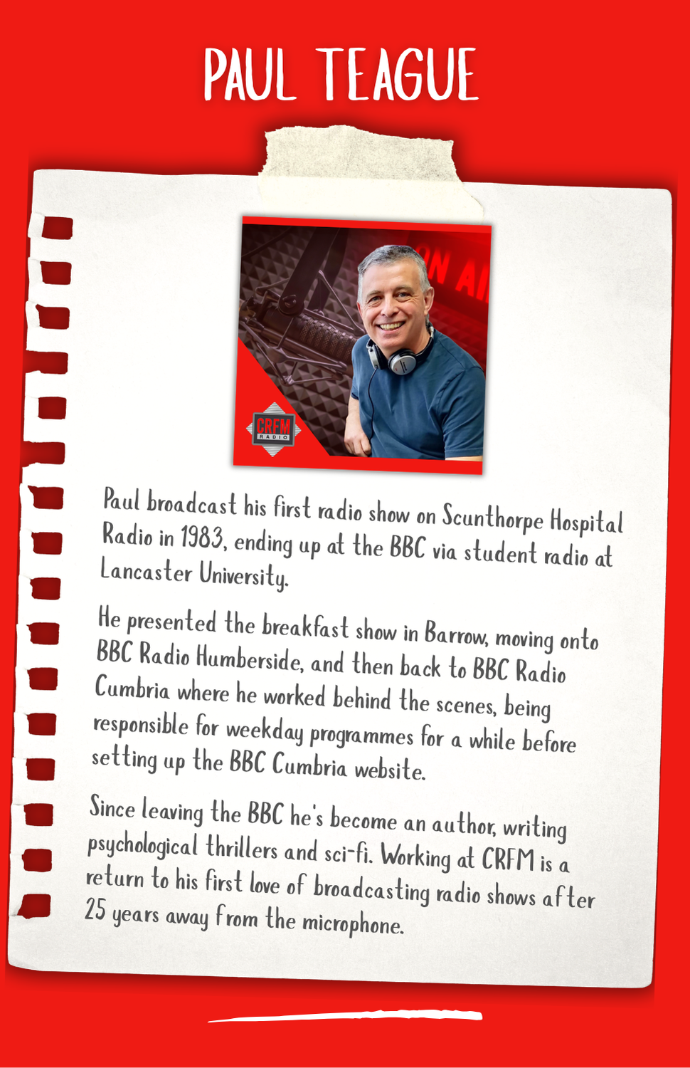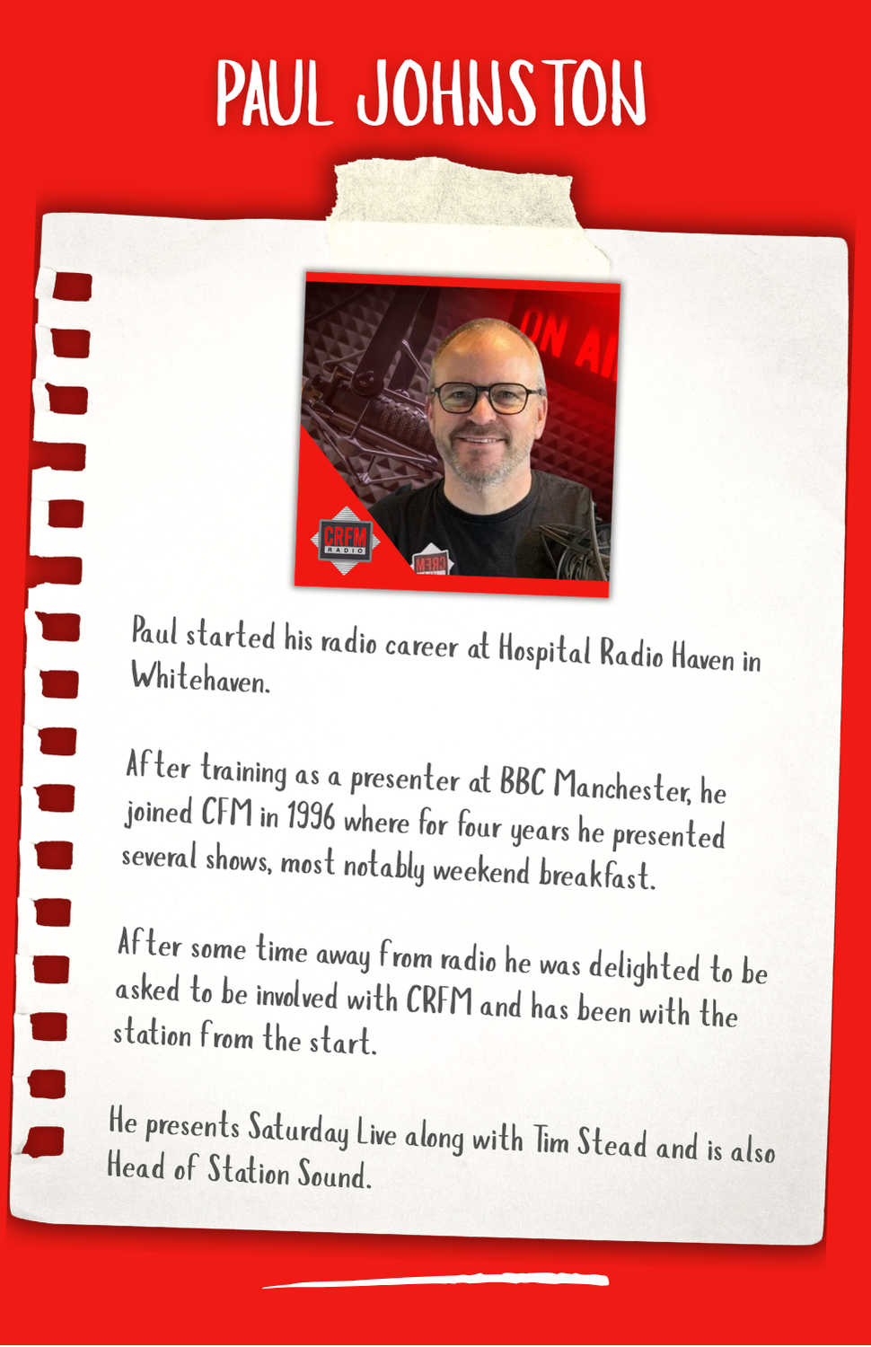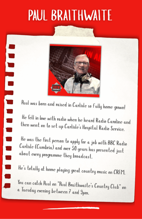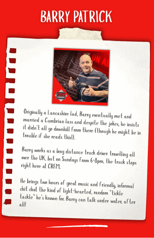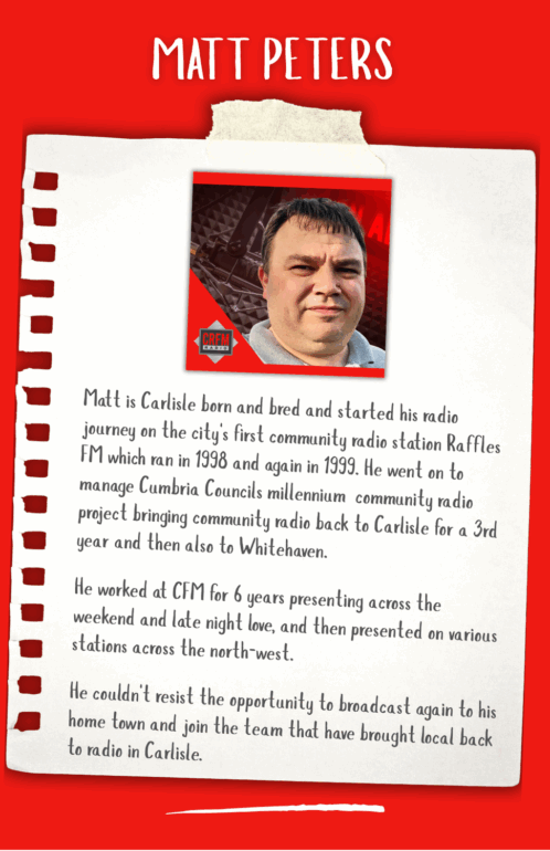 Hi my name is Darrell Thomas, I came to Cumbria in 1993 to assist with the launch of CFM Radio with John Myers. I then ran the station for 7 years before going off around the country to run a further 4 radio stations as well as one in Spain. I also was Deputy Advertising Director for Cumbrian Newspapers and although I have travelled a fair bit, I kept my home here in Carlisle knowing I would return one day. In Early 2023 I was asked to join the team and head up the launch of CRFM which was a no brainer. So here we are, a successful Community Radio station in the heart of the City of Carlisle. CRFM is growing from strength to strength - who knows what the future holds ...