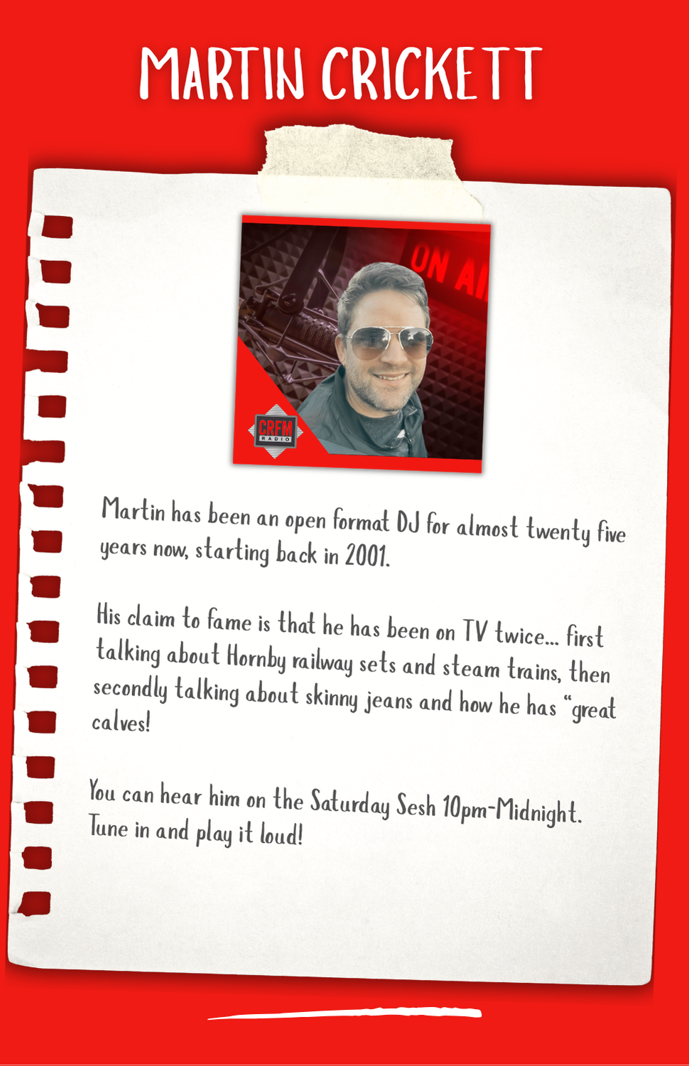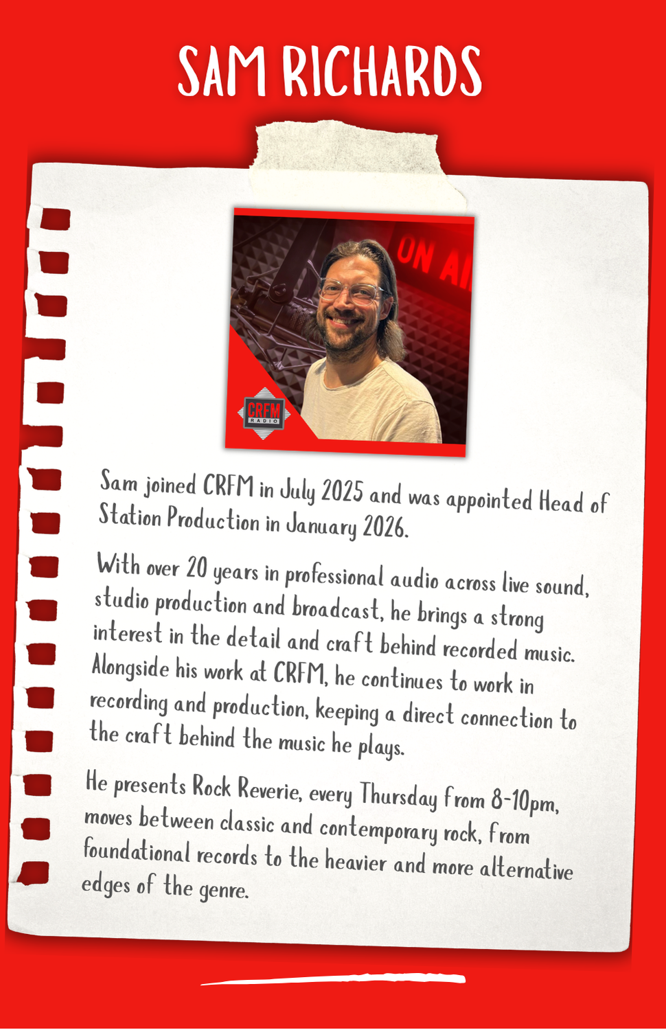 Hi, My name is Jack. I am the Head of Engineering at CRFM. Its my responsibility to make the whole station tick. From the database that holds all the amazing music you hear right up to the transmitter providing the music to your ears, and everything in between. If its to do with technology, I'm your man at CRFM.